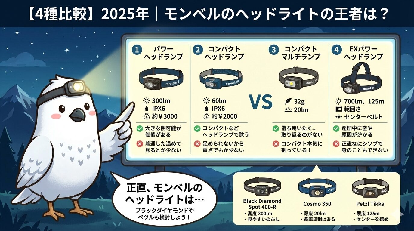 【4種比較】オススメなモンベルのヘッドライトは?