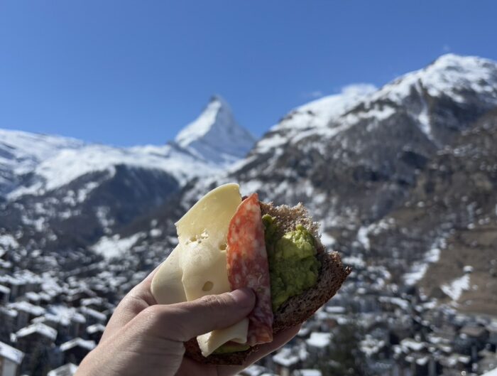 ツェルマットの駅から、展望台まで徒歩20分ぐらいなため、散歩がてら歩く。マッターホルンとツェルマットの美しい街並みを背景に、スーパーで買ったチーズ、サラミ、アボガドロをいただく。
